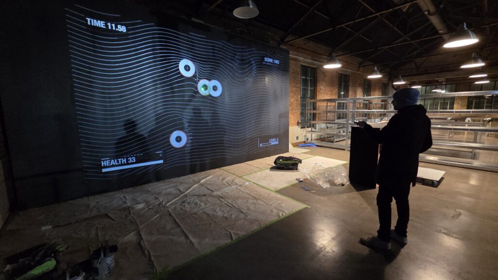 The installation was designed and developed as a real-time projection-based game using TouchDesigner, combining custom gameplay logic with live visuals and responsive scoring systems. Participants wore a bespoke laser glove interface, transforming physical movement into precise digital interaction.